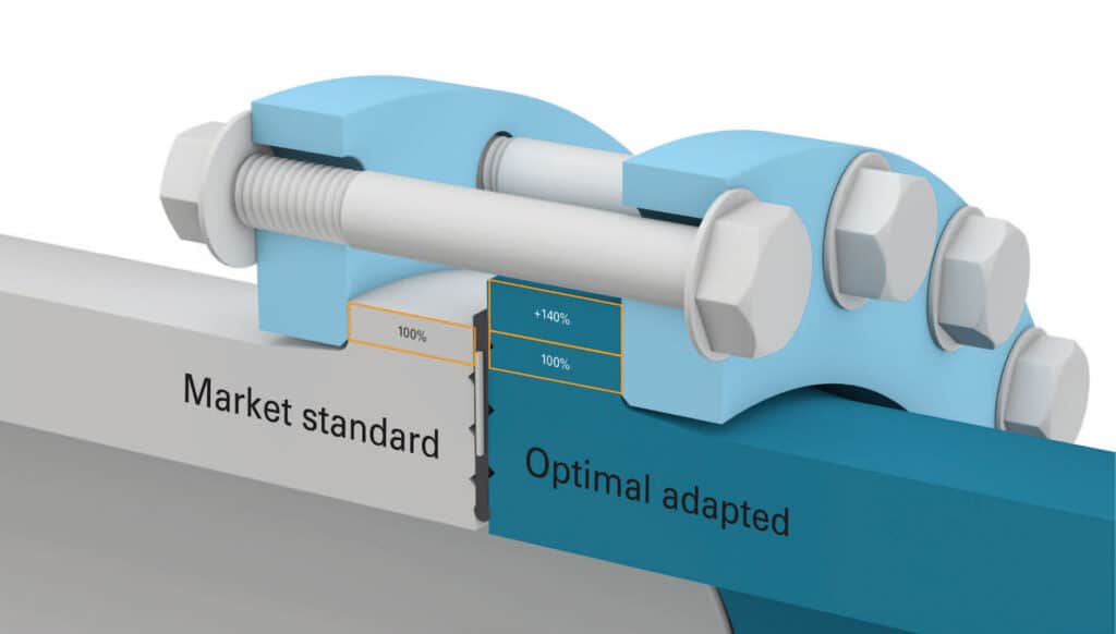 The raw material PE was developed in the 1960s and DIN standards for PE pipe joints were drawn up in the 1970s, which became the German standard in the 1980s and were partly used in this way worldwide. At that time, however, the application focus of plastic pipe systems was more on corrosion resistance than on operating pressure. It was therefore sufficient to use the standard steel loose backing rings as a basis for PE pipe systems, although the pipe diameters and also the wall thicknesses differed significantly from steel pipes. The plastic stub ends were pragmatically “adapted” to the backing rings in terms of dimensions and thus became the basis of the new DIN 16963–4 standard developed in 1988. The limited load-bearing capacity that resulted for some dimensions was even initially no problem for applications in the chemical industry. With increasing operating pressures around water supply for PE pressure pipe applications and, above all, nominal diameters far beyond DN 200 (picture 1), the limits of the load-bearing capacity of plastic flange connections became apparent in practice as early as the 1990s. Therefore, in 1996 Reinert-Ritz developed the fully pressure-loadable HP flange for PE pressure pipe systems. The triggering reason for this was a case of failure in which the DN 800 welding neck had ” jumped out ” from under the backing ring during the pressure test. With the development of raw materials to today’s PE100, the possible internal pressure load capacity increased again, so that in practice the weak point of standard flanges became increasingly obvious.